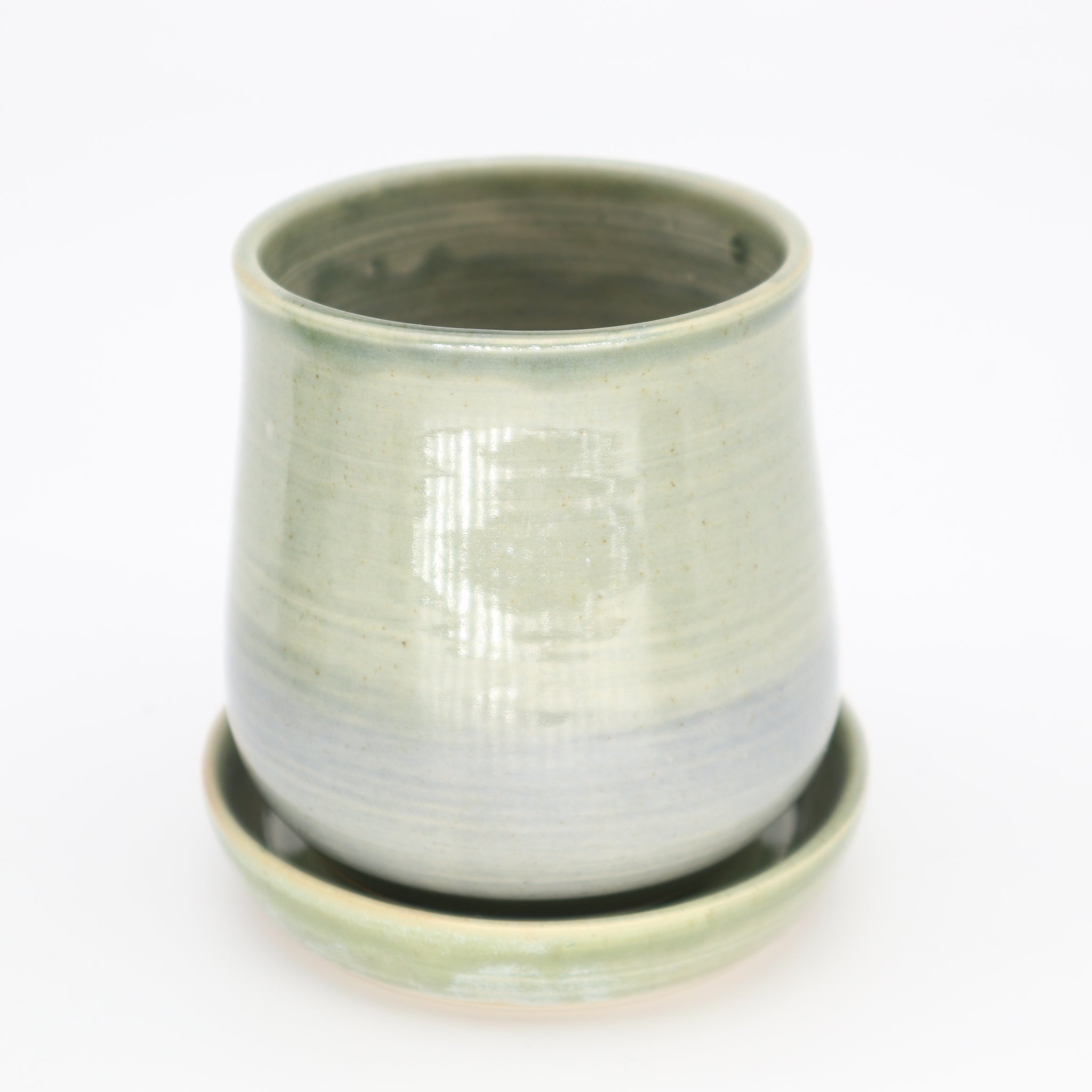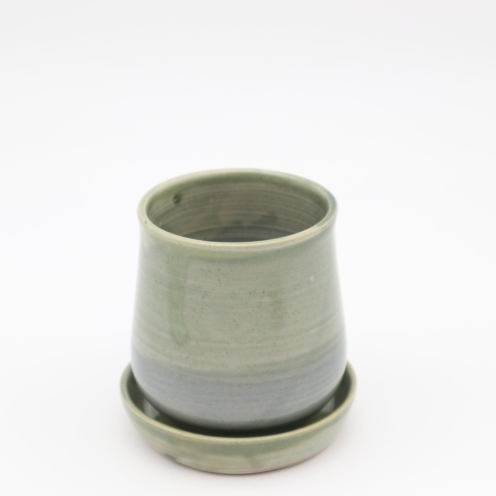 What could be more beautiful than plants in a hand thrown planter. Green rather small planter with a dish. b